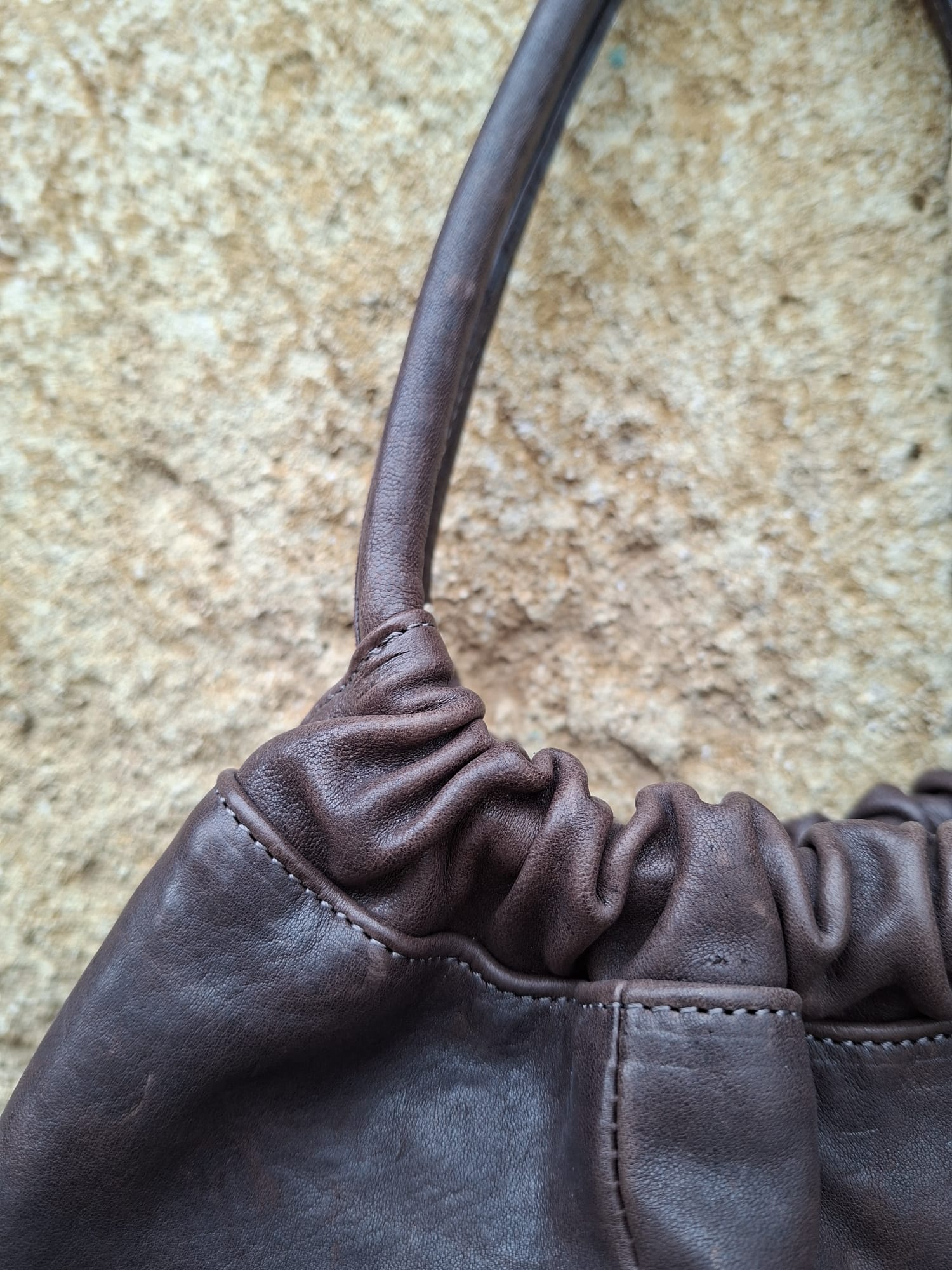 La borsa in pelle cerata Gaia è realizzata in 100% vera pelle bovina color coffee e misura 45 cm x 31 cm x 12 cm di profondità.